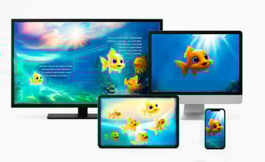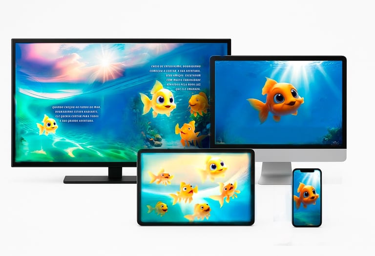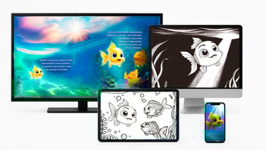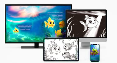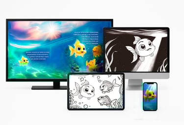 E-BOOK com controle manual da virada de páginas pela criança, com som da página virando, para a criança fazer a leitura da estória em seu próprio ritmo, para inspiração nos momentos de PINTURA dos desenhos e para ESTUDO de português.