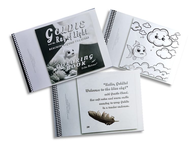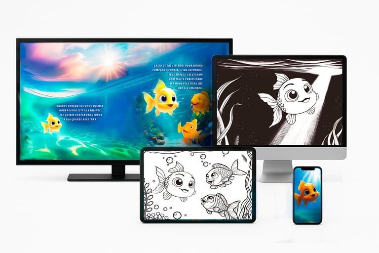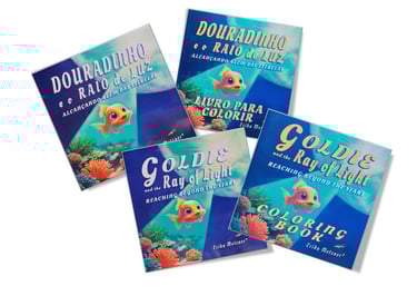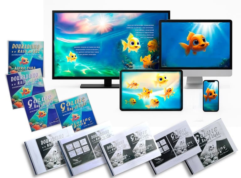 EBOOKS 1 - Crianças na fase de pré-alfabetização deixar que ela escute a estória várias vezes em português e em inglês enquanto ela estiver pintando os desenhos de GOLDIE e DOURADINHO. Os áudios em inglês devem ser escutados desde cedo pelas crianças para a familiarização com a sonoridade da língua inglesa. Além de colorir a estória elas podem usar o verso das páginas para esboçar as primeiras letras ou algumas poucas palavras. A criança pode ainda usar o verso das folhas para desenhar outros peixes, o fundo do mar, o céu, nuvens ou outros elementos e dar asas a sua imaginação e a sua vontade.
