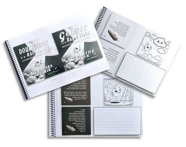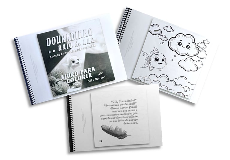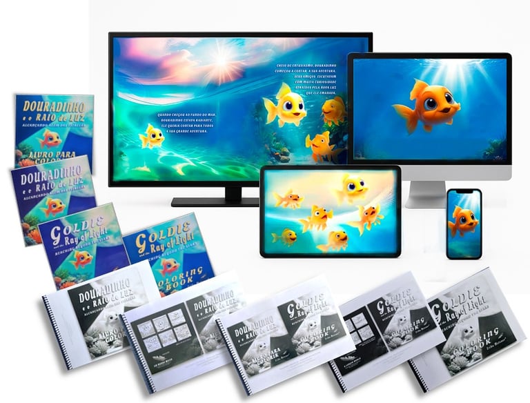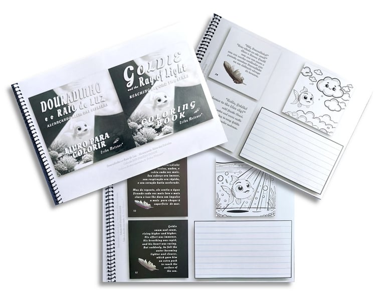 EBOOKS 3 E 4 - Crianças numa fase mais avançada de alfabetização podem ler e copiar a estória de uma página inteira em português em um dia, colorir o desenho dessa página num outro dia e no terceiro dia escutar e copiar a estória em inglês ao longo de uma semana. Se a criança já for mais avançada ela poderá usar o caderno BILINGUE e poderá copiar todo o texto em inglês no bloco de anotações, ou poderá colocar lado a lado a palavra em português e inglês, ou poderá copiar só as palavras nas quais ela teve alguma dúvida, seja na escrita, seja na tradução. Esse bloco de anotações do caderno BILNGUE também poderá ser utilizado para a criança escrever redações relacionadas à estória, podendo ser redações em português ou inglês, ou ela poderá ainda escrever sobre como ela se sente com relação à estória de Douradinho e Goldie. O bloco de anotações poderá ser usado das mais variadas formas e será muito interessante explorar esse espaço para atividades de interiorização como se fosse um diário do seu filho. A água simboliza as emoções e poderá de forma inconsciente despertar a interiorização da criança. Ela poderá fazer redações explorando as suas próprias emoções e sentimentos.