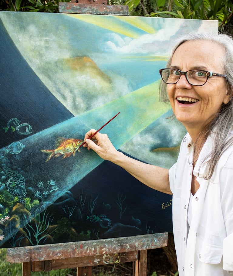 A simbologia presente na pintura ilustra a jornada de descoberta ou iluminação espiritual de um indivíduo (representado pelo peixe). O peixe está sendo guiado por um raio de luz, um chamado para ir além do mundo conhecido (o oceano) e alcançar algo maior (o céu). A obra reflete harmonia, transformação e transcendência, com um toque de mistério e esperança.